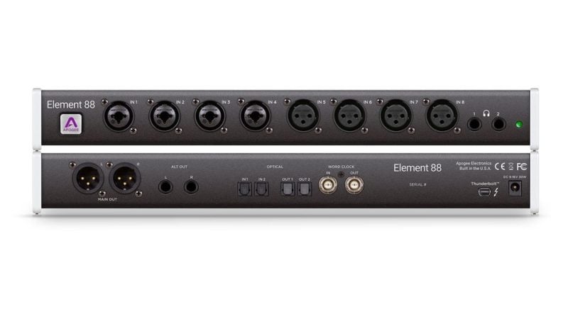 Interfaccia audio 16×16 con connessione Thunderbolt 2 di altissima qualità, latenza di soli 1.41 ms round trip @ 96kHz/32 buffer e conversione A/D e D/A a 24-bit/192kHz, dotata di 4 ingressi combo con selezione Line/Mic/Instrument, 4 ingressi XLR Line/Mic, 8 preamplificatori microfonici con guadagno fino a 75 dB, phantom power 48V, inversione di fase e soft limit indipendenti, 2 uscite bilanciate XLR, 2 uscite bilanciate jack da 1/4”, 2 ingressi e 2 uscite ottiche ADAT/S/MUX/SPDIF, ingresso e uscita Word Clock, 2 uscite cuffie con controllo del volume indipendente. Driver audio Thunderbolt proprietario, Core Audio ottimizzato, accesso a tutti i parametri dell’interfaccia tramite il software di monitoraggio / pannello di controllo Element Control per Mac, Element Control iOS o la superficie di controllo USB Apogee Control (venduta separatamente). Compatibile con Mac OS X e con tutte e applicazioni che supportano i driver Core Audio. Include staffe per il fissaggio a rack. N.B. Cavo Thunderbolt non incluso. Verificare nel sito del costruttore i requisiti minimi di sistema e i sistemi operativi Mac attualmente