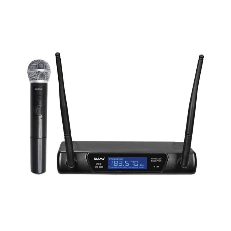 Radiomicrofono VHF comprensivo di una base ricevente e 1 microfono trasmittente “a gelato”. Sul pannello frontale un display retroilluminato segnala la corretta alimentazione la ricezione del segnale inviato dal radiomicrofono e la frequenza operativa. Sul retro è presente il tasto di accensione e la presa di uscita destinata a mixer o amplificatori. Il connettore è di tipo Jack 6,3mm.