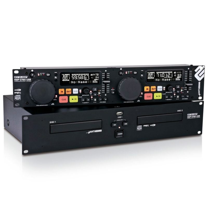 Doppio CD player MP3 compatibile, costituito da unità di lettura e unità di comando, dotato di audio di altissima qualità, comode jog wheel, BPM counter automatico e manuale, 2 porte USB per stck di memoria o hard disk, supporto ID3-TAG, MP3 track list, ricerca track and folder, display di grandi dimensioni, pitch +/- 4/6/8/16% (CD +/- 100%), pitch bend fino a +/- 16%, funzioni loop senza fine, frame search, instant start, single/continue play, relay e fade start play, memoria anti shock da 10 secondi, uscite audio di linea, dimensioni unità di lettura mm 482 x 88.8 x 262.5, unità di comando mm 482 x 88.8 x 94 peso unità di lettura kg 5.0, unità di comando kg 1.6, montaggio a rack 2+2 unità, alimentazione 230V.