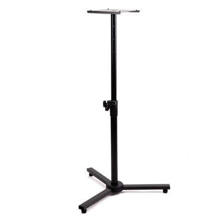Supporto per monitor audio, realizzato in metallo veniciato e dotato di piedini di isolamento, mensola d’appoggio da mm 230×230, passaggio interno dei cavi, altezza regolabile da mm 650 a mm 1160, peso kg 3,30.