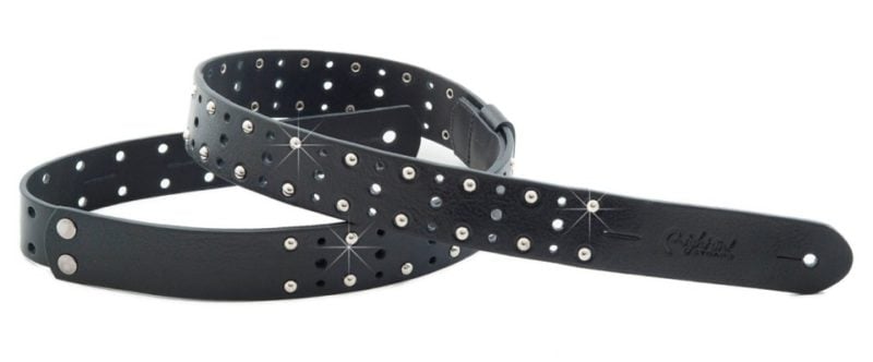 Tracolla in striscia di pelle bovina di alta qualità decorata con forature simmetriche e borchie, estremità in pelle bovina di alta qualità, sistema di regolazione RAS, porta plettri incorporato. Colore marrone nera, larghezza 4 cm, lunghezza regolabile da 96 cm a 144 cm. Indicata per chitarra