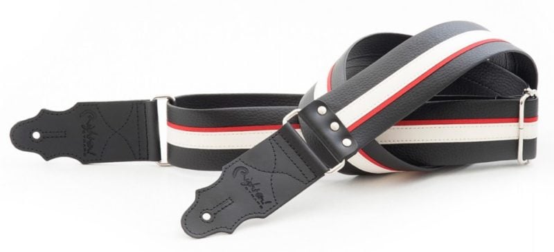 Tracolla in pelle sintetica di alta qualità decorata con linee bianche e rosse, estremità in cuoio di alta qualità. Colore nera, larghezza 5 cm, lunghezza regolabile da 86 cm a 150 cm. Indicata per chitarra e basso.