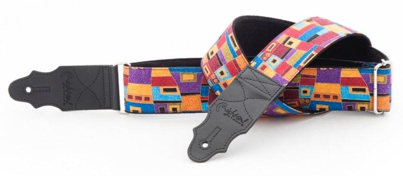 Tracolla in tessuto di alta qualità decorata con disegno astratto, estremità in cuoio di alta qualità. Colore multicolor, larghezza 5 cm, lunghezza regolabile da 86 cm a 150 cm. Indicata per chitarra e basso.
